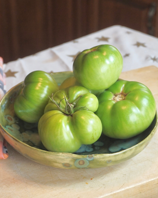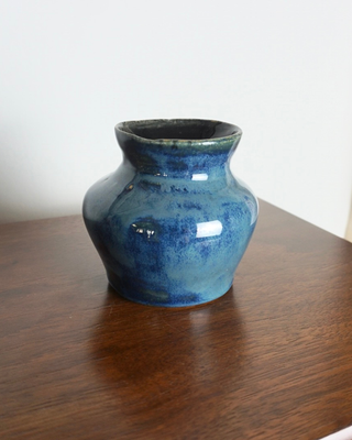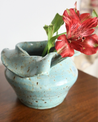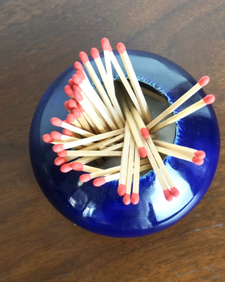 Metallic decorative object on a wooden surface with a colorful box in the background